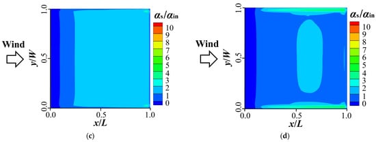 Distributions of dimensionless snow volume fraction αs/αin near the flat roof with various snow morphologies: (a) spherical form; (b) rosette form; (c) aggregated form; (d) plate form.