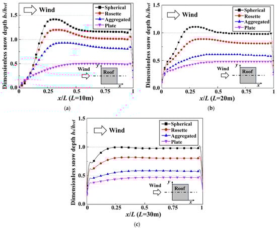 Dimensionless snow depth profiles across flat roofs of different spans after the accumulations of four types of snow particles: (a) a span of 10 m; (b) a span of 20 m; (c) a span of 30 m.