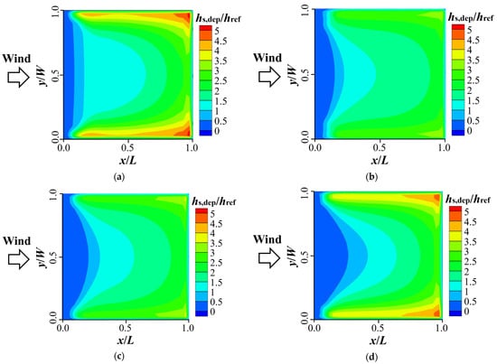 Figure 14 presents the contours of dimensionless snow depths hs/href for snow particles of various morphologies on the flat roof. The snow depths hs are normalized against the snow depth measured on open ground href. As the erosive impact exerted by the airflow on the flat roof has not yet attained the critical threshold in most areas, the eroded snow depth hs,ero would be zero (Equation (20)), and the snow distribution across the roof is predominantly governed by the snow deposition process. Notably, the deposition distribution characteristics of snow particles with varying morphologies demonstrate a strong alignment with the snow concentration distribution patterns. Specifically, the snow depth initiates at zero in the windward separation zone, progressively increases along the direction of the airflow, and reaches its maximum in the airflow reattachment area. Generally, as the drag coefficient of snow particles increases, the total snow depth formed by various types of snow particles on the roof shows a noticeable decreasing trend.