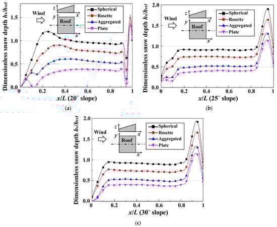Dimensionless snow depth profiles across single-pitched roofs of different slopes after the accumulations of four types of snow particles: (a) a slope of 20°; (b) a slope of 25°; (c) a slope of 30°.
