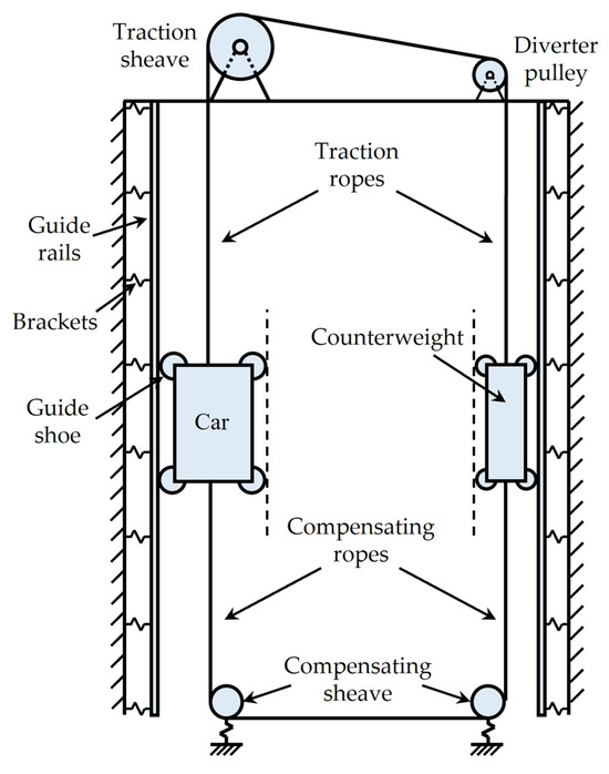 - Crespo, R.S.; Kaczmarczyk, S.; Picton, P.; Su, H. Modelling and Simulation of a Stationary High-Rise Elevator System to Predict the Dynamic Interactions between Its Components. Int. J. Mech. Sci. 2018, 137, 24–45. [Google Scholar] [CrossRef]