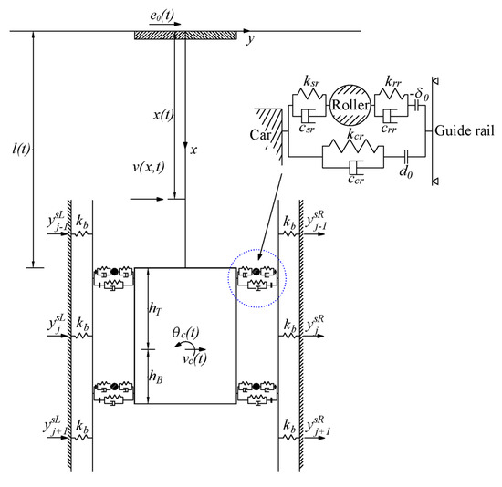 Based on the above assumptions, the dynamic model of the horizontal vibration for the coupled system incorporating the traction rope, car, guide shoe, and guide rail for high-speed elevator is illustrated in Figure 2. The coordinate origin is set at the upper end of the traction rope, with the x-axis oriented downward and the y-axis directed to the right. The rope is characterized by its linear density , elastic modulus E, and cross-sectional area A. Its length varies with time, denoted as , and the horizontal displacement at position x is expressed as . The car is modeled as a rigid body, neglecting elastic deformation, with height , vertical distance from the upper guide shoe to the car’s center, and vertical distance from the lower guide to the car’s center. The car has mass , moment of inertia , a horizontal displacement , and rotation . The stiffness and damping coefficients of the helical springs in the guide shoes are denoted by and , respectively. The stiffness and damping coefficients of the elastomer tires of the rollers are represented by and . The contact stiffness and damping coefficients between the retainer plate and the guide rail are denoted by and . The guide rail is characterized by its mass per unit length , elastic modulus , second moment of area . The span length is denoted by , and the total length by . The stiffness coefficient of each bracket is identical and denoted by . At time t, the positions of the upper and lower guide shoes are represented by and , respectively. The parameter represents the deformation of the series system consisting of the helical spring and the elastomer tire under the pre-tightening force , where the negative sign indicates compression. The parameter denotes the initial clearance between the retainer plate and the guide rail. The upper-end excitation of the traction rope is expressed by , while the excitations at the j-th bracket of the left and right guide rails are represented by and , respectively.