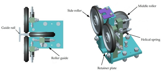 Guide shoes, which serve as critical components connecting the car and guide rails, are generally classified into two types: sliding shoes and roller guides. Roller guides provide superior performance compared with sliding shoes by replacing sliding friction with rolling friction under pre-tightening force, thereby enhancing vibration damping and reducing operational noise. Additionally, roller guides do not require lubrication, which simplifies maintenance and improves system reliability. Owing to these advantages, roller guides are commonly employed in high-speed elevators. In this study, the term guide shoe specifically refers to the roller guide. A typical roller guide is illustrated in Figure 3. To prevent derailment, a retainer plate is usually mounted on the shoe base, with a notch that engages the rail. During normal operation, the rollers remain in continuous contact with the guide rails under pre-tightening force, while the clearance between the retainer plate and the rail allows slight car oscillations—an assumption commonly adopted in previous studies [1,2,3,4] on elevator car horizontal vibration. However, under strong wind or earthquake excitations, the car may experience severe vibrations, resulting in frequent impacts between the retainer plate and the guide rail, and in extreme cases, leading to derailment. Based on mechanical analysis, the guide shoe is modeled as a multi-spring–damper system, as illustrated in the enlarged view in Figure 2. Notably, the viscous damping elements are depicted to schematically represent the general form of guide shoe–rail interaction. In the subsequent analysis, the contact force is primarily governed by the stiffness component, while the local damping effect is not explicitly considered.
