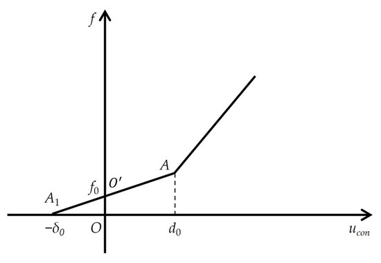 The force-displacement curves of the guide shoe are presented in Figure 4. The point , indicates that, due to the pre-tightening lead, an initial force exists while the initial displacement is zero. From point to point A, the stiffness is governed by , until the clearance between the retainer plate and the guide rail becomes zero. Beyond point A, the stiffness is provided by the parallel spring formed by and . When the displacement increases in the negative direction, the initial pre-tightening force is gradually released until point A1 where the stiffness becomes zero. The stiffness coefficient of the guide shoe, , can be expressed as a piecewise function of the displacement as