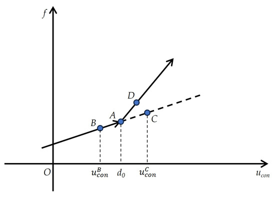 Due to the presence of stiffness discontinuities (points A1 and A in Figure 4) in the force–deformation curve of the guide shoe, i.e., inflection points, special treatment is required when applying the Zhai method to avoid distortion of the numerical results. In this study, a linear interpolation approach is employed to adjust the time steps that include these inflection points. Figure 5 illustrates the treatment process for inflection point A; the same procedure applies to other cases.