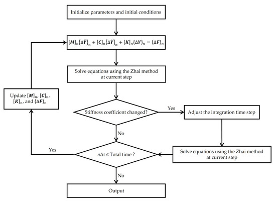 In the train-track-bridge dynamic interaction system, Zhai [17] introduced a new simple explicit two-step method, known as the Zhai method, which has attracted extensive attention. This method is fast, efficient, and well-suited for solving large-scale nonlinear dynamic equations. The interaction problem between the traction-rope, car, guide shoe, and guide rail shares many similarities with the train-wheel-rail contact problem, particularly when considering the nonlinearities arising from contact forces and time-varying effects. Consequently, in this study, the Zhai method is applied to solve Equation (20).