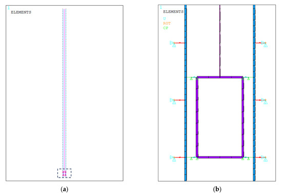 Finite element model of the elevator traction rope–car–guide shoe–guide rail coupled system. (a) Overall configuration; (b) Enlarged view of the car region.