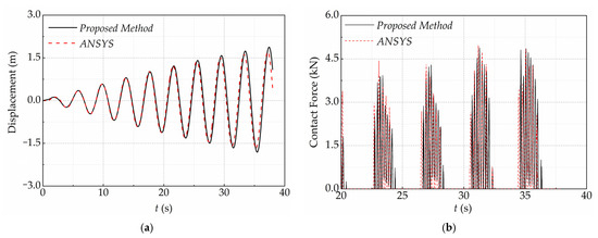 Comparison between the proposed method and ANSYS results. (a) Horizontal displacement at the traction rope midpoint; (b) Contact force between the retainer plate of the upper-left guide shoe and the guide rail.