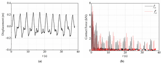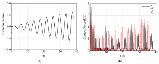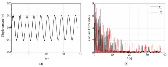 Figure 9, Figure 10 and Figure 11 present the time histories of the traction rope midpoint displacement and the contact between the upper guide shoe and the guide rail when the car is stationed at the bottom, middle and top floors, respectively. As illustrated in the figures, resonance of the traction rope occurs prominently when the car is at the bottom floor, where the rope length is greatest and its fundamental frequency closely matches the building’s excitation frequency. As the car ascends, the rope length decreases, leading to a rapid reduction in the rope’s vibration amplitude. Notably, during the initial vibration phase, the contact force between the guide shoe and the guide rail is relatively high due to the lag of the car response relative to the rail response, but it decreases rapidly as the system enters the steady-state stage. Moreover, the amplitude of the guide shoe–guide rail contact force in steady-state is significantly higher when the car is at the bottom floor compared with the other two positions, and the contact force increases in proportion to the rope’s vibration amplitude. These findings indicate that the traction rope vibrations exert a significant influence on the dynamic response of the elevator car system.