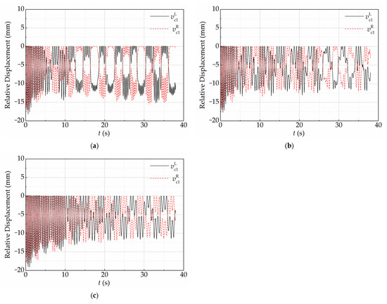Time histories of the relative displacement between the retainer plate of the upper guide shoe and the guide rail. (a) Bottom floor; (b) Middle floor; (c) Top floor.