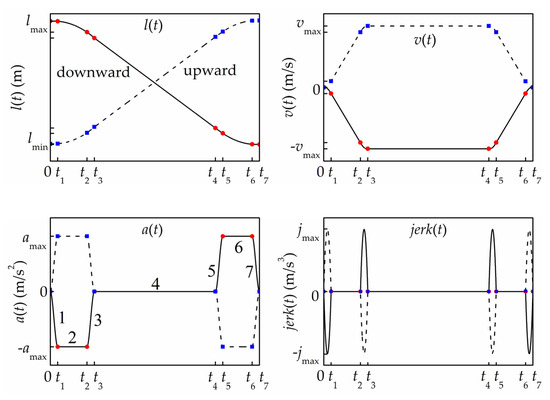 Tian et al. [22] demonstrated through a comparison of four different operation profiles that the parabolic-linear control strategy provides the most favorable operation curve for high-speed elevators. Accordingly, this operation profile is adopted in the present study to investigate the dynamic response of the coupled system during elevator operation. A fifth-order polynomial is employed to describe the operation profile, which is divided into seven stages, as illustrated in Figure 13, where l(t), v(t), a(t) and jerk(t) denote the rope length, elevator velocity, acceleration and jerk at time t, respectively. Stages 1, 3, 5, 7 correspond to varying acceleration, each with a duration of tj; stages 2 and 6 correspond to constant acceleration, each with a duration of ta; while stage 4 represents constant velocity with a duration of tv. The total operation time ttotal satisfied the following relationship among tj, ta, and tv.