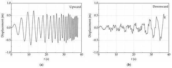 where n denotes the total number of stories. Based on this relation, a value of T1 = 4.0 s is adopted as a reasonable estimation in this study. According to the provisions of the Chinese code [21] (pp. 17–18), an amplitude of 0.1 m at the top story is adopted to represent a moderate sway scenario. The building sway is modeled as sinusoidal motion, and the corresponding displacement excitation applied at the upper end of the traction rope is expressed as