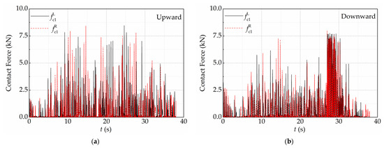 Guide shoe–guide rail contact force at a maximum velocity of vmax = 5.0 m/s. (a) Upward motion; (b) Downward motion.