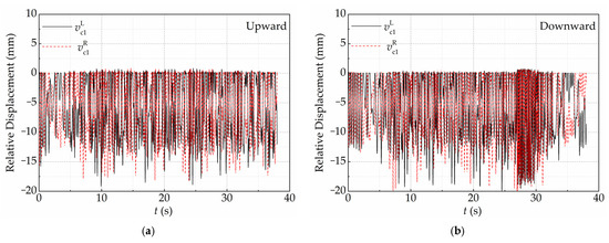 Relative displacement between the retainer plate of the upper guide shoe and the guide rail at a maximum velocity of vmax = 5.0 m/s. (a) Upward motion; (b) Downward motion.