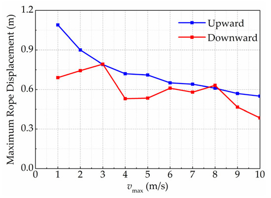 The effect of maximum operating velocity on the system response is examined by computing the maximum dynamic responses for ten cases, with vmax ranging from 1.0 m/s to 10.0 m/s. The detailed operating parameters are listed in Table 2, and the results are represented in Figure 17, Figure 18 and Figure 19. As shown in Figure 17, the maximum vibration amplitude at the traction rope midpoint decreases with increasing operating velocity during upward motion, with a sharp decline when vmax is below 4.0 m/s. During downward motion, the amplitude decreases overall, although fluctuations are observed. This reduction is due to the shorter time the car spends passing through the transient resonance region at higher operating velocities. In general, the amplitude during upward motion is greater than that during downward motion. Figure 18 and Figure 19 illustrate that both the maximum guide shoe–guide rail contact force and the relative displacement between the retainer plate and the guide rail increase with operating velocity, highlighting the significant influence of vmax on the coupled system’s dynamic response. Excessive contact force may result in damage to the guide shoes, buckling of the guide rails, or failure of the brackets, which can severely compromise the safety and stability of the elevator system. Furthermore, excessive relative displacement between the retainer plate and the guide rail could cause the elevator car to derail, posing a serious safety hazard.
