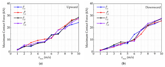 Maximum guide shoe–guide rail contact forces for four guide shoes at different maximum operating velocities. (a) Upward motion; (b) Downward motion.