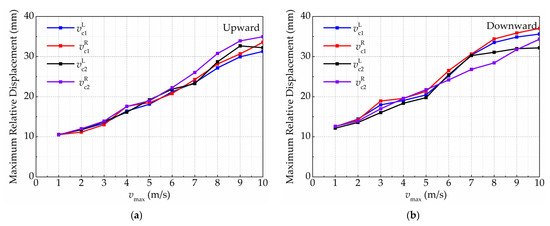 Maximum relative displacement between the retainer plate and the guide rail for four guide shoes at different maximum operating speeds. (a) Upward motion; (b) Downward motion.
