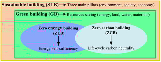 In the literature, SUBs are frequently characterized by their reduced dependence on virgin resources and lower energy demands, alongside diminished emissions and waste output relative to conventional construction practices [12,13]. Some scholars further define SUBs as GBs that exhibit enhanced greenhouse gas (GHG) mitigation potential, thereby supporting the achievement of ZCB objectives [14]. As defined by the US Environmental Protection Agency [15], a GB is conceptualized as a structure designed, constructed, and operated through processes that prioritize environmental responsibility and resource efficiency across its entire lifespan. The World Green Building Council (WorldGBC) defines GBs as those designed to mitigate negative impacts on the climate and natural environment throughout their life cycle, while simultaneously improving human quality of life [16]. The understanding of GBs is continually evolving; they are commonly defined as “providing people with healthy, applicable, efficient space and natural harmonious architecture with the maximum savings on resources (energy, land, water, materials), protection for the environment and reduced pollution throughout its whole lifecycle” [17,18,19].