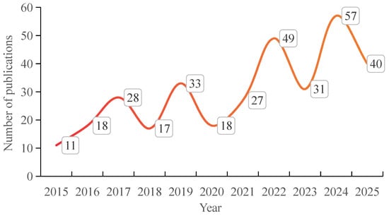 Figure 3 presents the annual count of review articles on SUBs over the last ten-year period (January 2015–July 2025), revealing significant fluctuations and long-term trends in the research output of this field. The publications show an overall growth trend, from 11 publications (2015) to 57 publications (2024), indicating surging academic and industrial interest in SUBs. Publication growth was slow during the first five years but accelerated rapidly in the subsequent five-year period. In addition, the sharp rise in 2024 suggests a peak in research activity, possibly driven by global net-zero commitments (e.g., COP28, stricter building codes). The drop to 40 publications in 2025 is attributed to incomplete data for that year, as only the first half was included.