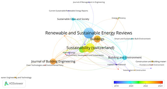 Figure 4 illustrates the most popular and suitable journals for publication in the SUB field, as identified through journal source analysis using VOSviewer software. A total of 112 sources were identified among the 329 review papers, and the minimum number of papers was set to 2 for each of the sources. Finally, 34 connected sources were obtained, and detailed information is provided in Table 1. The size of a journal’s node and label corresponds to its number of publications; thus, larger nodes indicate a higher publication output. Therefore, it is obvious that Renewable and Sustainable Energy Reviews is the most popular journal, having the highest publication number, 40 articles, and the highest citation number, 3931. The second-most popular journal was observed to be Sustainability (Switzerland) (publication number: 33, citation number: 1250), followed by Buildings (publication number: 23, citation number: 502), Energy and Buildings (publication number: 20, citation number: 1993), and Energies (publication number: 20, citation number: 539). The line connecting two nodes reflects two key characteristics: the frequency of citations between two journals and the link strength between two journals. Specifically, a thicker line represents a higher citation frequency, while a shorter distance indicates a stronger link strength between journals. With a total link strength score of 108, Renewable and Sustainable Energy Reviews is the most active journal in the studied field, followed by Building and Environment with a total link strength score of 91. Although the number of articles published in Environmental Chemistry Letters, Cleaner Engineering and Technology, and Automation in Construction was less than 3, and the citation number was less than 200, these three journals have the highest impact on the field of SUBs, reflected by avg. norm. citations. The color of the node represents the average publication year of articles in that journal. The data indicate that Frontiers in Built Environment began publishing research on SUBs in 2025, and Clean Technologies and Environmental Policy, Results in Engineering and Journal of Facilities Management started publishing related articles in 2024. By contrast, Applied Energy, Current Sustainable/Renewable Energy Reports, and Journal of Management in Engineering were the first to start publishing related articles.