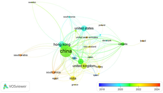 Figure 5 illustrates the main countries active in SUB research, reflecting the relationship and contribution of different regions in this field. In VOSviewer, the minimum number of articles and the minimum citation number were set to 2 and 100, respectively. Finally, a total of 26 countries were identified from 71 countries, as shown in Table 2. The largest node was observed to be China, which had the highest number of published articles, with 83, and the highest citation numbers, with 5799. This was followed by Australia (articles = 44, citations = 3529) and Hong Kong (articles = 39, citations = 3868), and it is obvious that these three countries have made considerable contributions in the studied field. In China, the dual-carbon policy launched in 2020 may be a key factor that has greatly stimulated the enthusiasm for investigating SUBs. In Australia, the globally recognized GBRS (i.e., Green Star) program, policy guidance and promotion, and innovative technologies are possibly the main factors that greatly promote SUB development. In Hong Kong, BEAM Plus, promoted by the Hong Kong Green Building Council (HKGBC), and the “Hong Kong Climate Action Plan 2050”, launched by the government, have facilitated the low-carbon transformation of the construction industry and the realization of the global carbon neutrality goal. In addition, as the node color reflects the average publication period of articles in a country, Egypt (articles = 9), South Africa (articles = 16), Saudi Arabia (articles = 11), and Brazil (articles = 8) have recently paid great attention to the review studies regarding SUB. By contrast, Spain (articles = 7), Italy (articles = 15), and France (articles = 6) have conducted earlier review studies on the related field. Although Japan, Egypt, and New Zealand each published fewer than 10 review articles, with less than 700 citations, they demonstrate the highest impact on SUB research as reflected by their average normalized citation values.