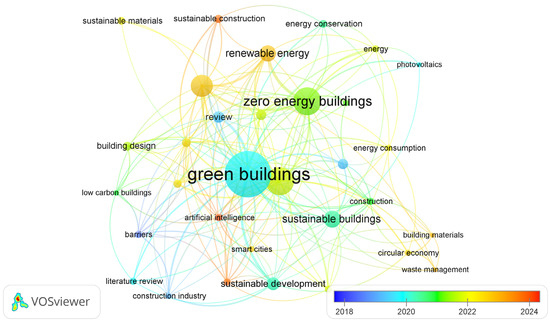Figure 6 presents the core keywords identified from the selected review articles that were analyzed using “Author keyword” in VOSviewer. The threshold for the minimum number of occurrences was four, and keywords representing the same concept (e.g., “green building” versus “green buildings” versus “green building (gb)”, “net zero energy building” versus “net-zero energy building” versus “nearly zero energy building” versus “zero-energy buildings” versus “zero energy buildings” versus “nzeb”, “energy saving” versus “ energy conservation”) were combined to reduce redundancy. Ultimately, 46 keywords were retained from the initial pool of 1082 after applying the thresholds, and the detailed information of the core keywords is provided in Table 3. As the size of nodes and fonts corresponds to keyword frequency, “green buildings” (occurrences: 85) emerges as the most prevalent keyword, with “zero energy buildings” (occurrences: 45), “energy efficiency” (occurrences: 34), and “sustainable building” (occurrences: 24) following in descending order. In addition, the thickness of the connection line clearly reflects the link strength between two nodes; in other words, it reflects the frequency of co-occurrence or the intensity of cooperation of the pair of keywords. The high total link strength of a node is the sum of all connection strengths of the node. It was observed that the high total link strength of “green buildings” and “sustainability” reflect their roles as cross-cutting themes in SUB research, linking sustainable development, renewable energy, and energy efficiency topics. Keyword occurrence periods are color-coded, revealing a clear shift: while earlier literature frequently addressed “construction industry”, “review”, “life cycle assessment”, “green buildings”, and “barriers”, contemporary research focuses on “sustainable construction”, “artificial intelligence”, “bibliometric analysis”, “sustainable materials”, “smart cities”, “building information modeling”, and “building materials”. Although the keywords “construction industry,” “systematic review”, “circular economy”, “energy conservation”, “sustainable construction”, “artificial intelligence”, and “energy” each have no more than 10 occurrences, their high average normalized citation scores demonstrate their notable impact in recent research.