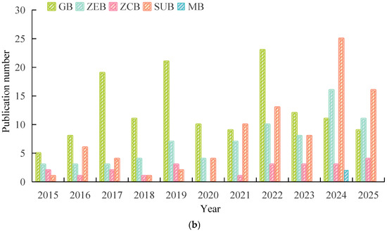 Categorical breakdown of building types. (a) Distribution of different building types (MB: Mixed Buildings; GB: Green Buildings; ZEB: Zero Energy Buildings; ZCB: Zero Carbon Buildings; SUB: Sustainable Buildings). (b) Publication number of different building types in each year.