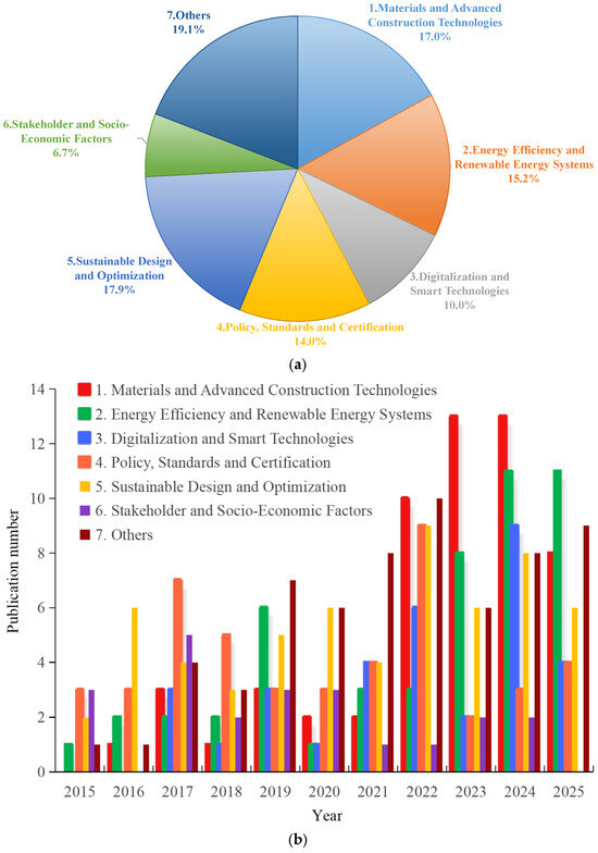 This study classifies SUB research into seven themes, and Figure 9 shows the categories of research themes (Figure 9a) and the publication trends under each category (Figure 9b). The seven themes are material and advanced construction technologies (17.0%), energy efficiency and renewable energy systems (15.2%), digitalization and smart technologies (10.0%), policy, standards, and certification (14.0%), sustainable design and optimization (17.9%), stakeholder and socio-economic factors (6.7%), and others (19.1%). The “others” category comprises articles addressing general or specific topics (e.g., terminology, indicators, critical success factors) that do not belong to the above six primary themes. An overall growth trend was observed for all seven themes. In the initial year (2015), all seven themes had limited publications, each with fewer than five articles. However, publications on both material and advanced construction technologies and energy efficiency and renewable energy systems numbered more than 10 in 2024; breakthroughs in sustainable materials (e.g., carbon-neutral cement), advances in solar/wind technology and policy implementation were the possible reasons accelerating the sharp increase in these publications. Similar publication numbers were observed for three categories in 2014, i.e., digitalization and smart technologies (9), sustainable design and optimization (8), and others (8). The remaining two categories, i.e., stakeholder and socio-economic factors and policy, standards, and certification, showed minor fluctuations. In addition, the publication reduction in several categories in 2020 and 2021 may be caused by COVID-19 pandemic disruptions. Increased attention and research output are anticipated for all seven themes in the future.