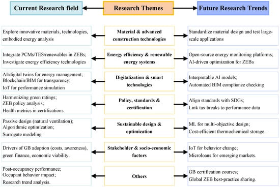 The seven research themes identified in this study paint a picture of the features of building sustainability. Theme 1—Material and advanced construction technologies, theme 2—Energy efficiency and renewable energy systems, and theme 3—Digitalization and smart technologies primarily address the environmental pillar, aiming to reduce resource consumption and ecological impact. Theme 4—Policy, standards, and certification provides the regulatory and evaluative framework for driving the of goals of building sustainability. Theme 5—Stakeholder and socio-economic factors mainly addresses the social and economic pillars, exploring drivers, barriers, and financial mechanisms. Theme 6—Sustainable design and optimization serves as an integrative practice that balances the three pillars of building sustainability (i.e., environment, society, and economy). Achieving true sustainability in the built environment demands simultaneous advancements across all interconnected areas, moving beyond a narrow focus on energy and carbon to embrace broader socio-economic well-being and resilience.
