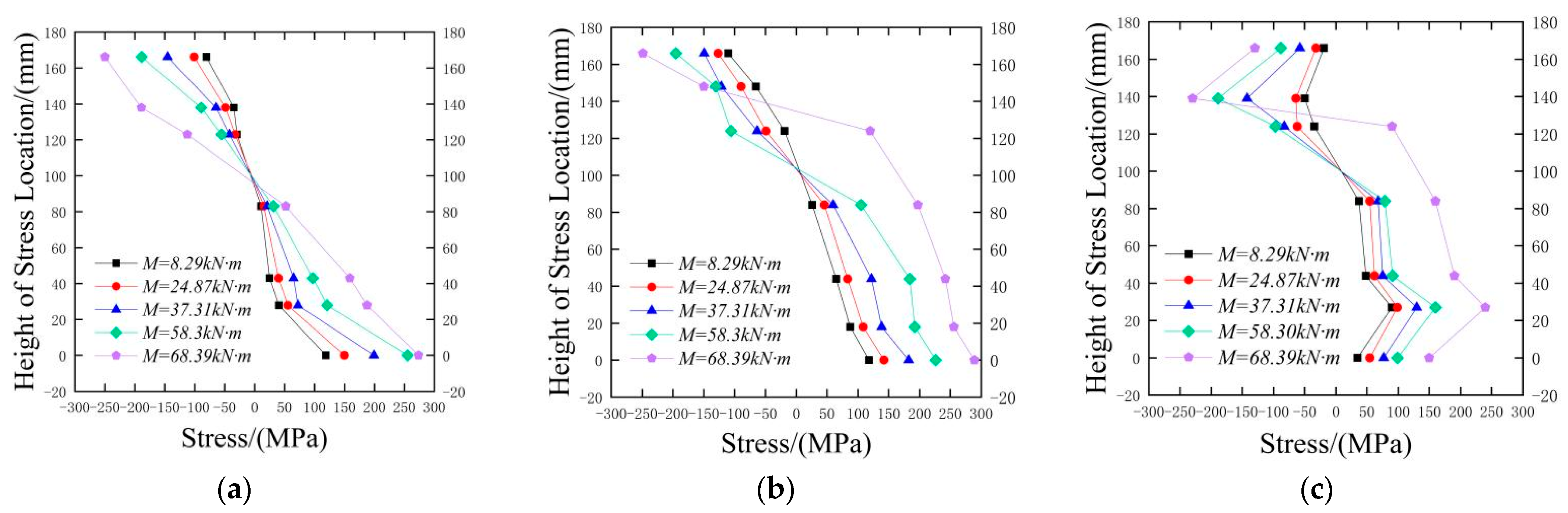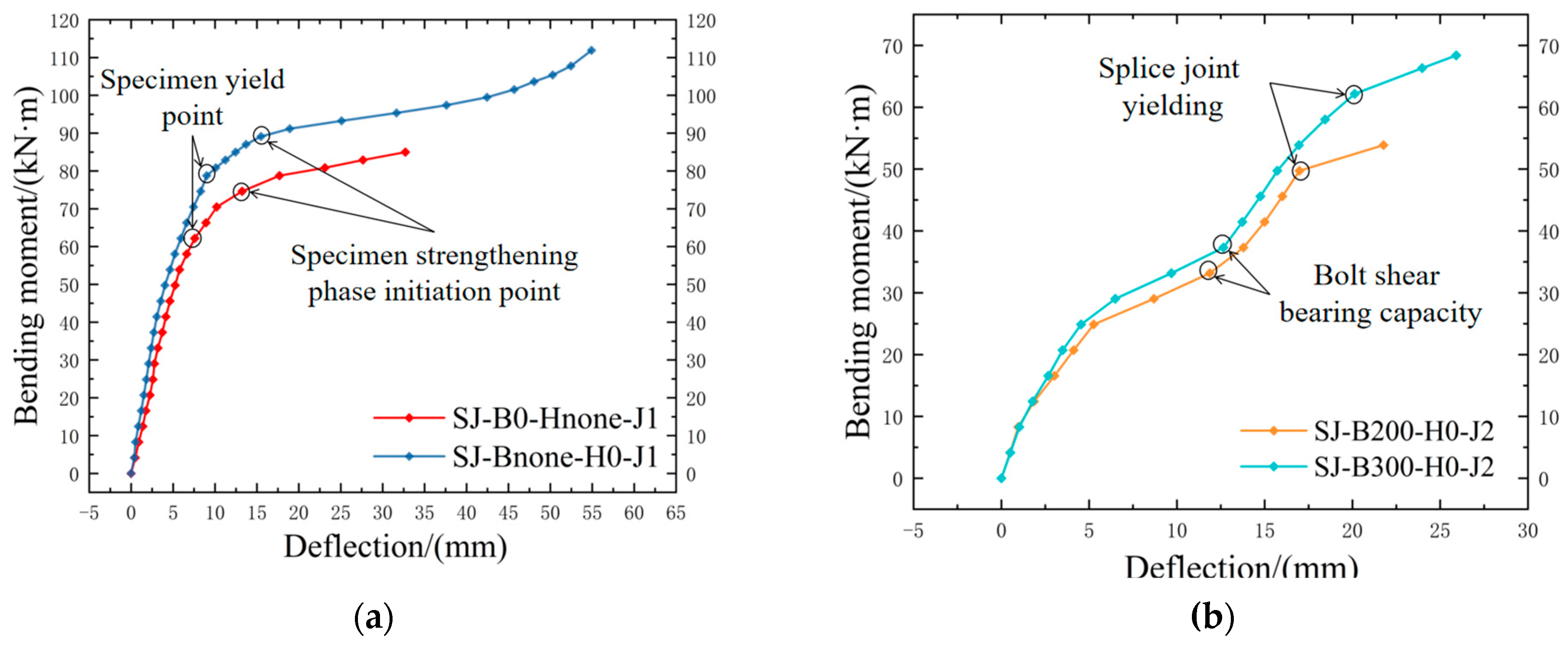 - Specimens featuring double splice joints demonstrate a substantial reduction in bending load-bearing capacity and stiffness compared to those with single splice joints. Using the single H-shaped steel assembly as a reference, the ultimate bending load-bearing capacity decreases by approximately 24.07% when employing single connection plates. When both splice joints are present simultaneously, the specimen’s ultimate bending load-bearing capacity declines by 39.89% to 51.88%. Notably, specimens with two splice joints spaced 200 mm apart (SJ-B200-H0-J2) exhibit the lowest bending load-bearing capacity. Consequently, engineering practices should avoid positioning two splice joints in adjacent or overlapping locations. As the distance between the two splice joints increases, the specimen’s bending load-bearing capacity markedly improves.