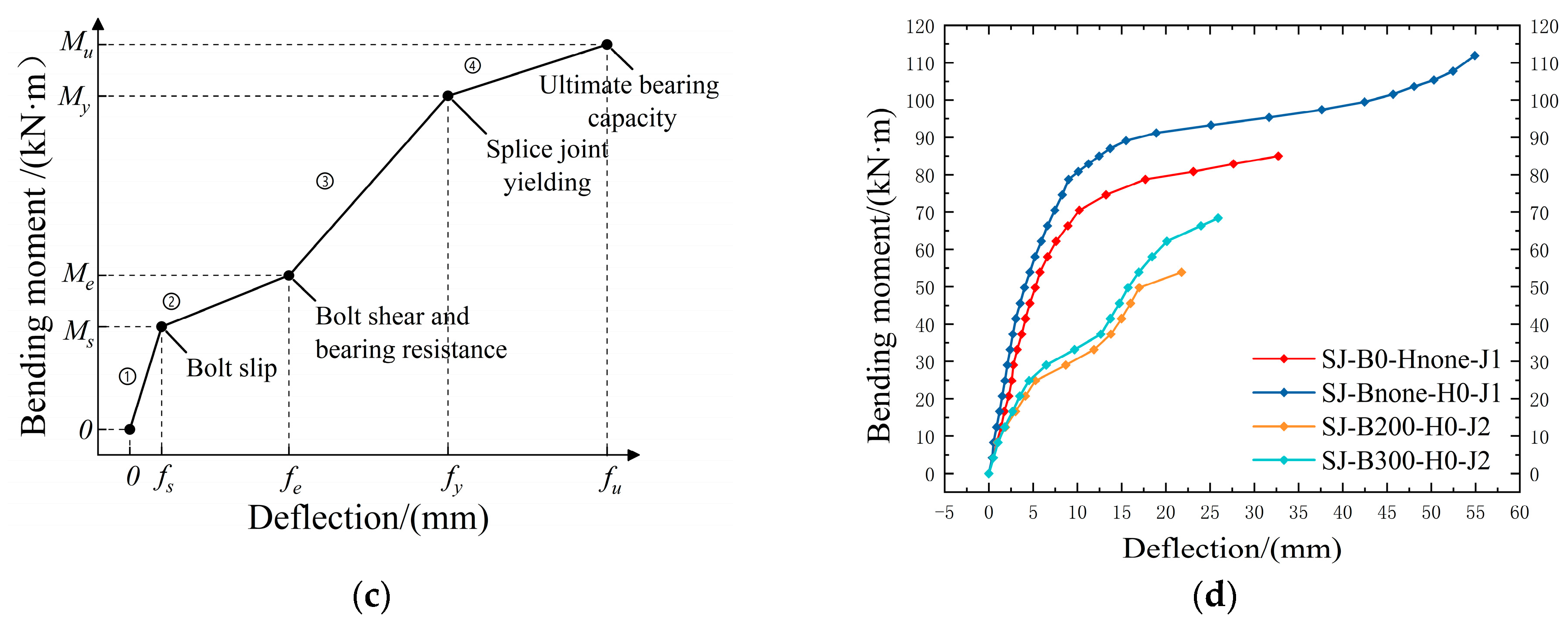 - During testing, the double-shear joint specimen undergoes four deformation phases under load: 1. Bolt friction compression stage; 2. Bolt slip stage; 3. Component coordinated stress stage; and 4. Yield stage. Under pure bending loads, components at the joint assembly site fail first, preventing the observation of a significant plastic deformation phase in the specimen.