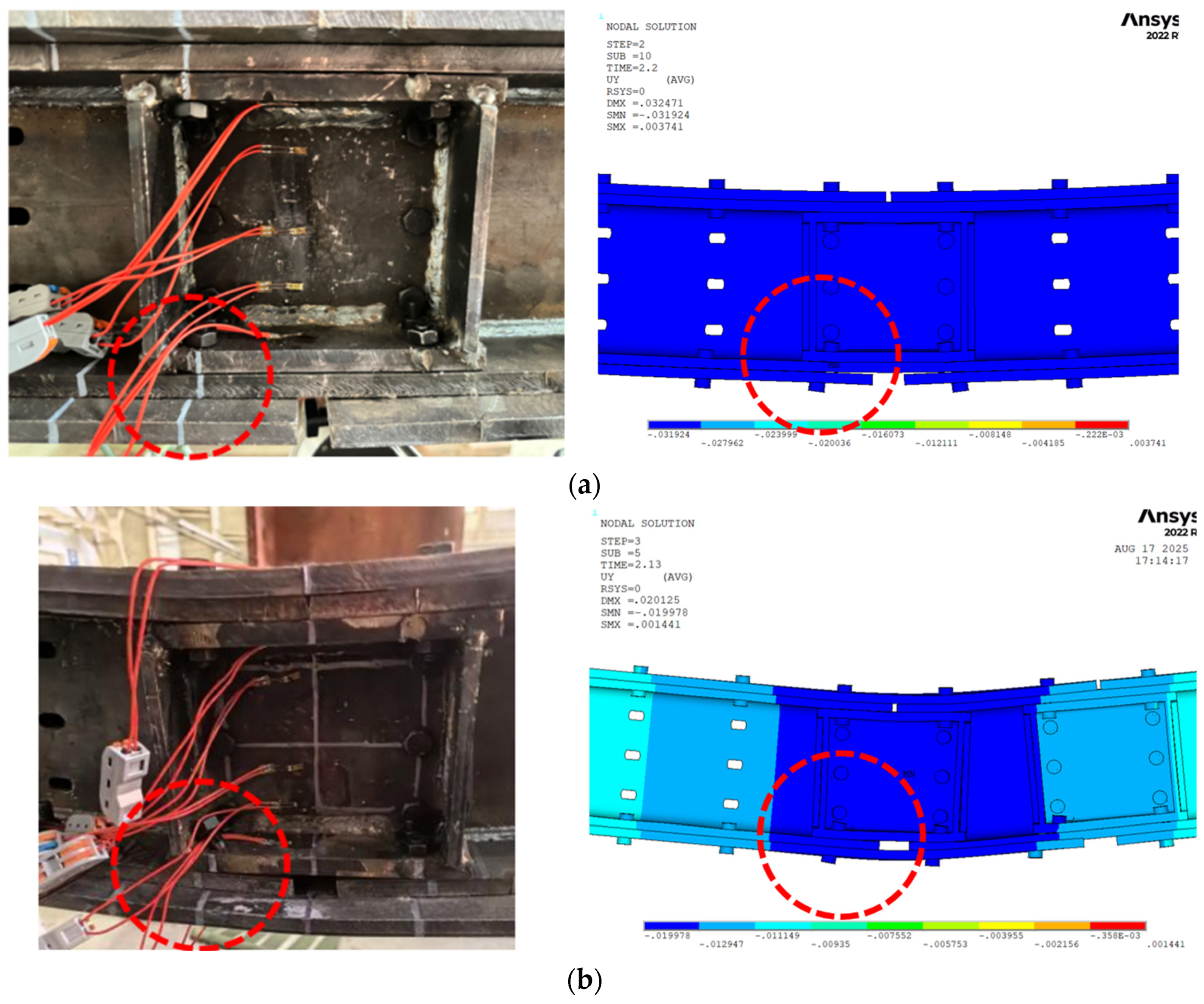 - Both connection plate splice joints and HM150 steel section splice joints are classified as semi-rigid joints. Based on experimental data and numerical simulation results, corner calculation formulas for single splice joints under pure bending loads that account for angular deformation effects were developed, along with deflection calculation formulas. Additionally, rotational spring nodes were introduced to simulate the converted rotational stiffness of splice joints. Furthermore, a deflection calculation formula for double splice joint specimens during elastic deformation stages was proposed. All calculated values aligned with the experimental results.