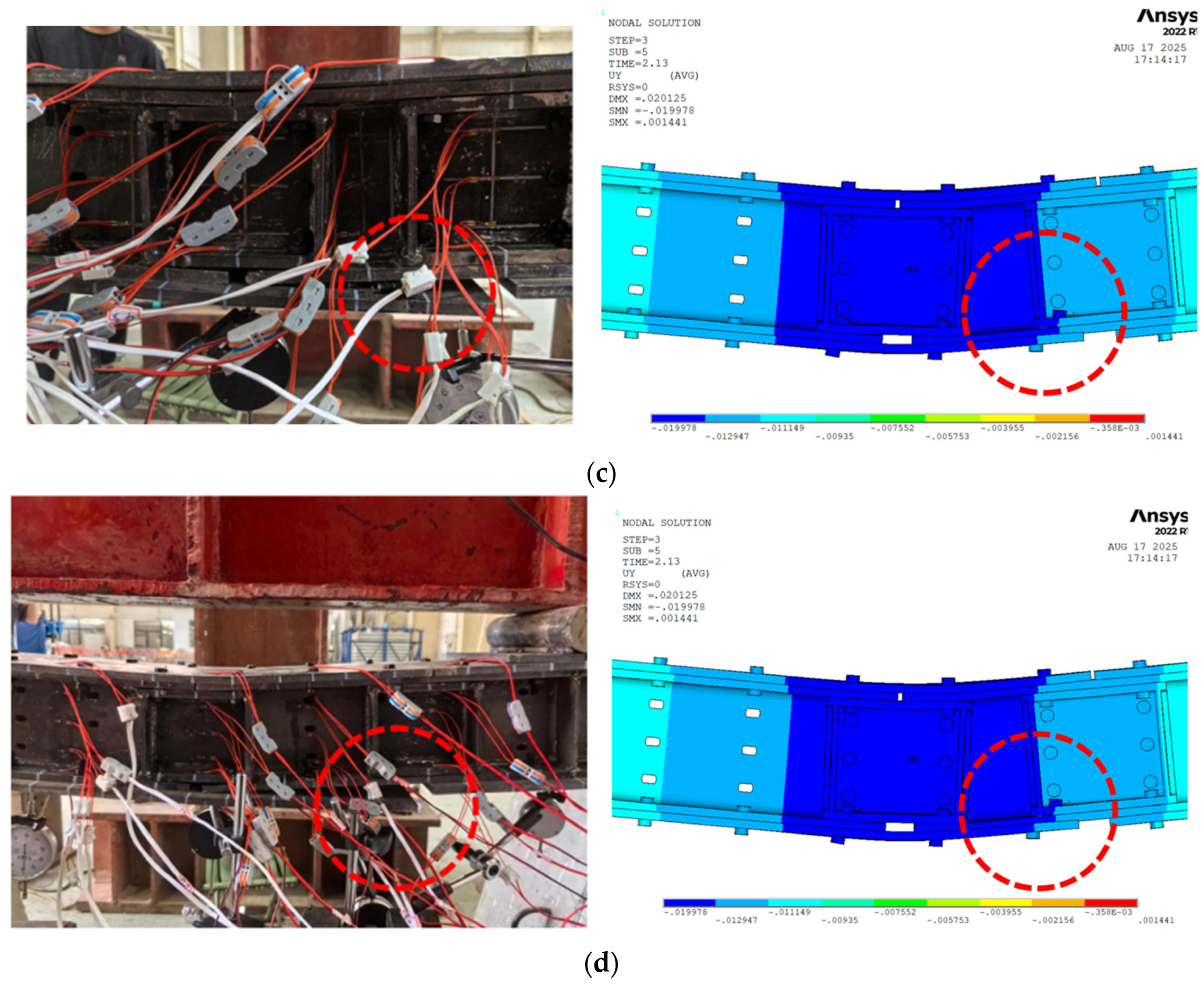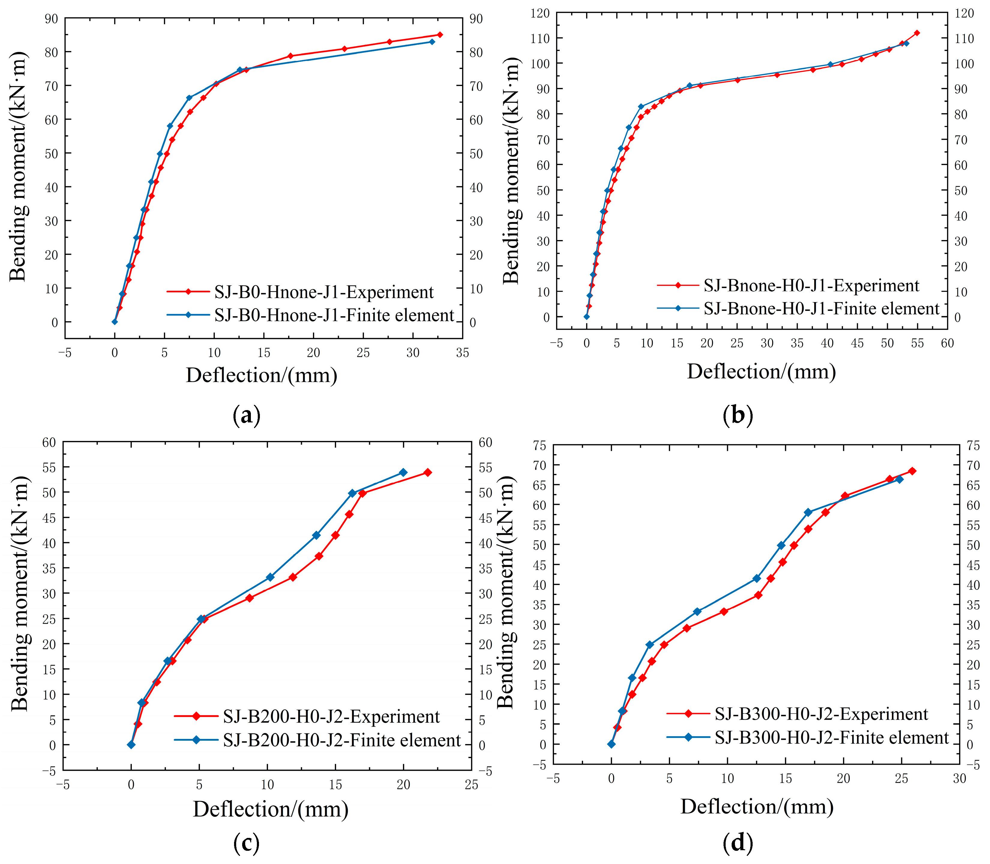 - Mechanical testing of prefabricated H-shaped steel beams was performed alongside finite element modelling to validate the results. The close correspondence between experimental outcomes and simulation data across all specimens confirms the reliability of the testing methodology. This demonstrates the capability of the tests to accurately characterise the mechanical behaviour of prefabricated H-shaped steel beams under actual loading conditions, providing a robust analytical tool for subsequent design optimisation.