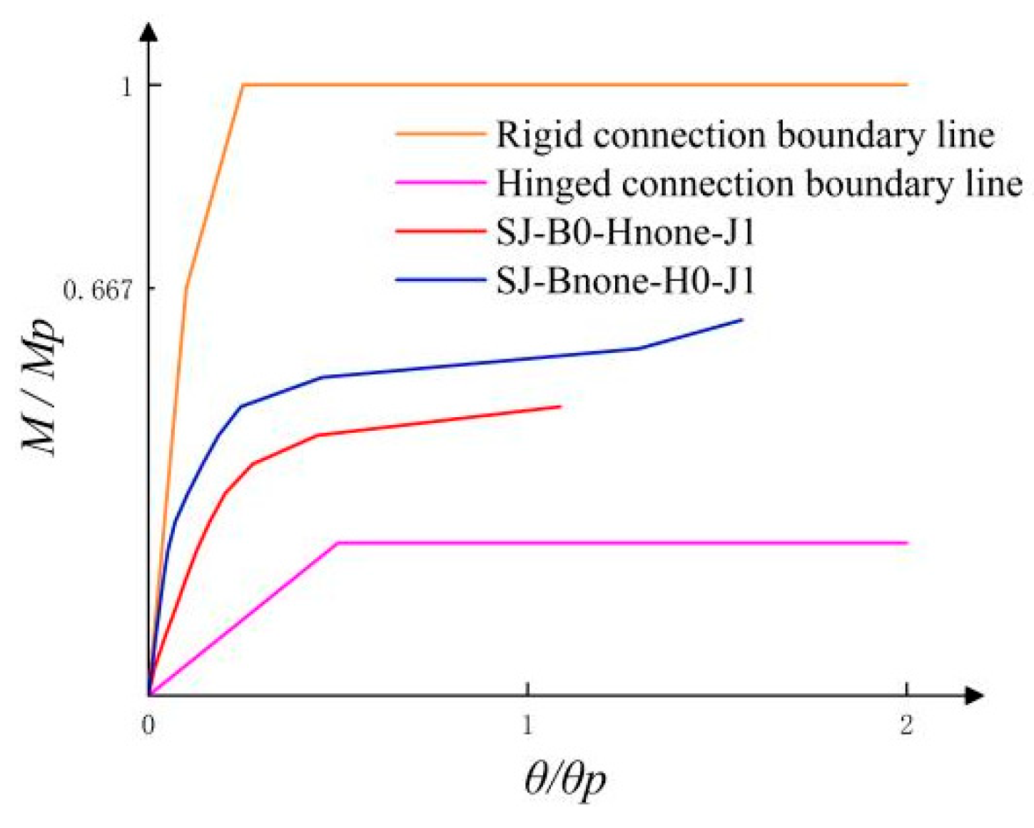 Name of Specimen | The Plastic Ultimate Bending Moment Borne by the Node Mp /kN·m | The Angle of the Node at the Plastic Bending Moment Mp of the Node θp /rad | Elastic Bending Moment of the Node Mk /kN·m | The Node Rotation Angle at the Elastic Bending Moment Mk of the Node θk /rad | Initial Rotational Stiffness Sj,ini /kN·m·rad−1 |