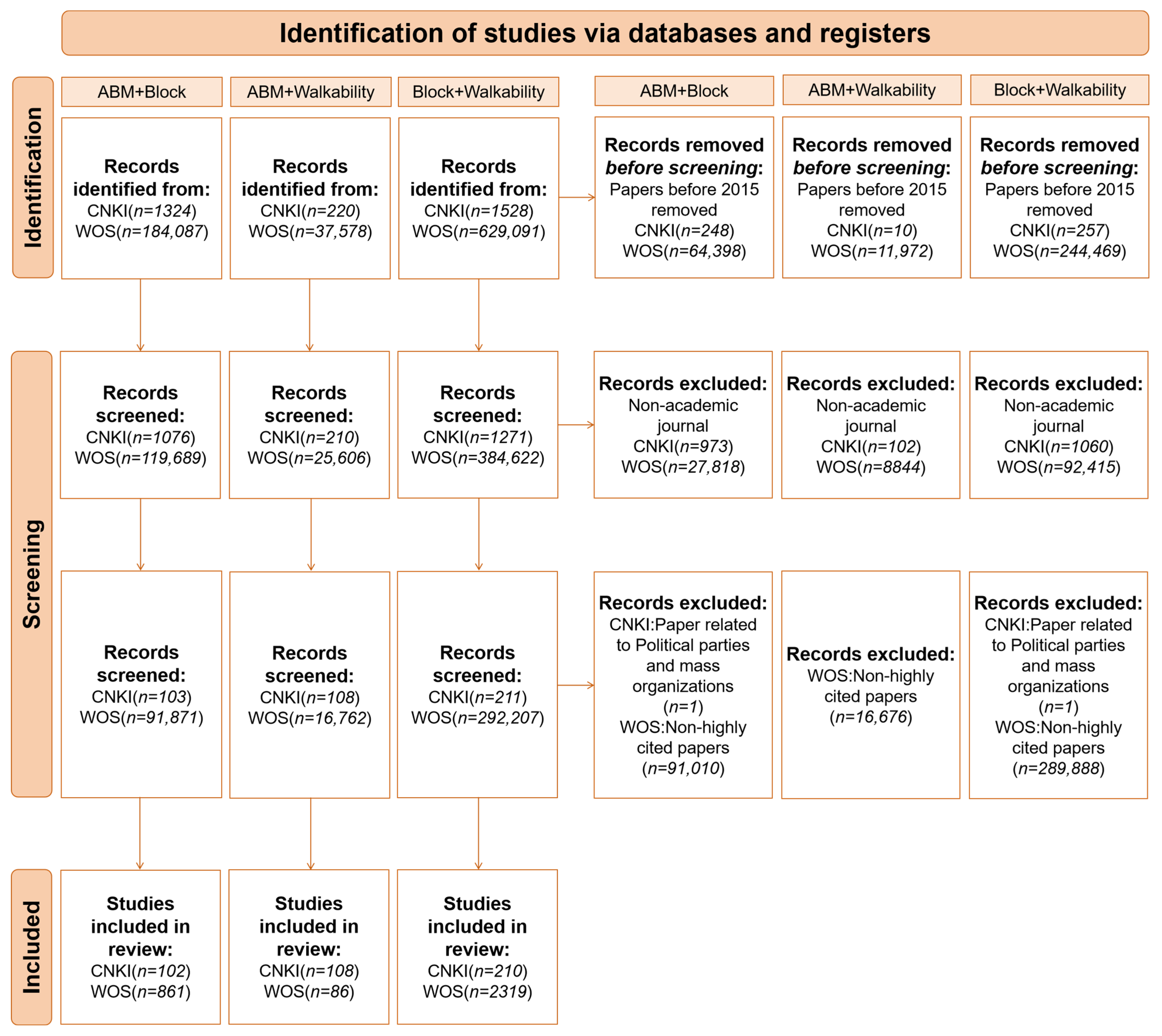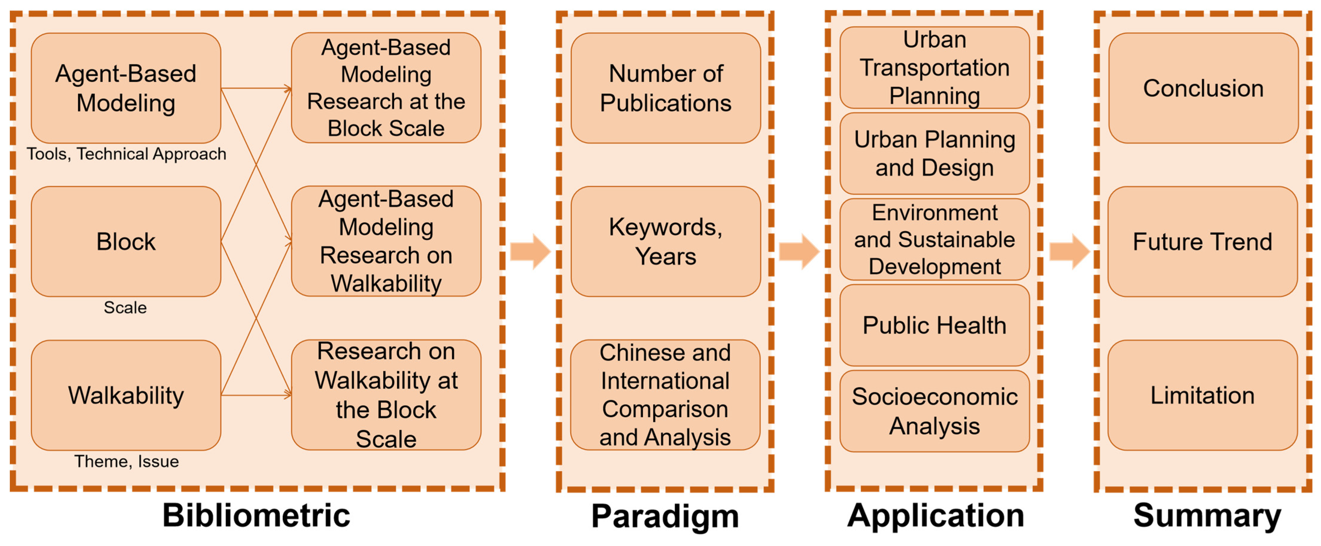 3. Comparative Analysis of Chinese and International Literature on ABM, Walkability, and Block-Scale Research
