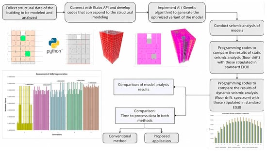 Figure 1 shows the general flow chart of the methodological process proposed in this research. The process begins with the collection of information from the base building, a structure of seventeen regular levels, which includes sections of structural elements, material properties, geometric configuration, and gravitational and seismic loads, among other relevant parameters. These data are organized in an Excel file for further processing.