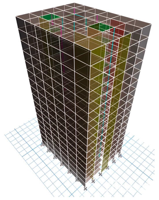 Building modeled on ETABS, different colors represent the structural sections of the elements (columns, beams, and walls).