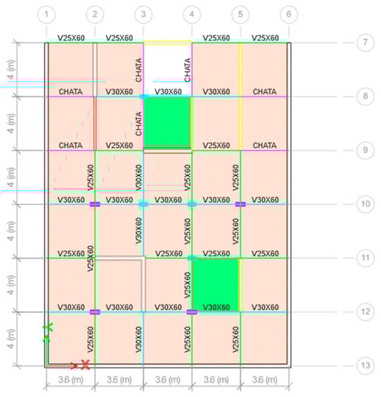 Two main types were considered: column C1, with dimensions of 0.25 m by 0.60 m, and column C2, of 0.30 m by 0.70 m. Both were designed with a concrete compressive strength of f’c = 210 kgf/cm2. Reinforced concrete beams are distributed in both longitudinal and transverse directions, connecting columns and transferring loads to the vertical elements. The beam system consists of three types: a beam of 0.25 m by 0.60 m, another one of 0.30 m by 0.60 m, and a flat beam of 0.10 m by 0.10 m. All beams were designed with a concrete strength of f’c = 210 kgf/cm2. The structural cut-off walls are located in central areas of the building, simulating vertical circulation cores, with the aim of providing strength and lateral rigidity. Five types of walls were modeled, all with a concrete strength of f’c = 210 kgf/cm2, differentiated by their thicknesses: 0.15 m, 0.25 m, 0.28 m, 0.30 m, and 0.40 m. Finally, Story drift was considered, differentiated into lightened slabs for typical floors, in order to optimize the system’s own weight, and solid slabs in specific areas where higher load concentrations or stiffness requirements are expected. This model, as presented in Figure 2 and Figure 3, is a generic representation of mid-rise urban buildings commonly designed in the Latin American context and was used as a basis for evaluating automation methodologies in structural modeling and seismic analysis.