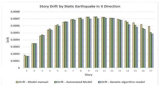 The results obtained in Figure 4 and Figure 5, which present the story drifts of static analyses performed with the traditional model and the automated model using the ETABS API, demonstrate a significant improvement in accuracy with the automated approach. The value of R2 = 0.9950 indicates that the automated model explains 99.5% of the variability of the manual results, reflecting an almost perfect fit. Furthermore, the RMSE = 1.93 × 10−5 is extremely low, reinforcing the conclusion that the difference between both approaches is practically negligible and that the automated model successfully replicates the structural response under static seismic loading.