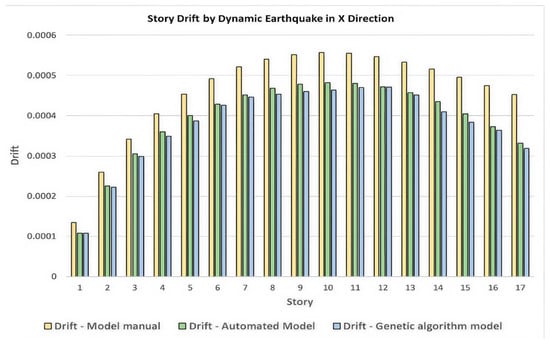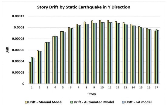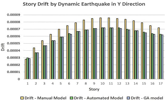Figure 10 shows the results of the drift under dynamic analysis in the Y direction. In this case, the maximum drift is also detected on the 10th floor, with values of 0.000504 for the manual method, 0.000456 for the automated, and 0.000437 for the genetic, generating a maximum difference of 0.000067. Although the curves are similar in form, it is evident that the genetic algorithm tends to offer lower values than the traditional method. This is related to the way in which the algorithm optimizes the input parameters or the effective rigidity of the model. In all cases, the structural behavior remains within acceptable ranges, and the regulatory limit value is met, ensuring that the building does not present problems of excessive deformation due to dynamic seismic action.