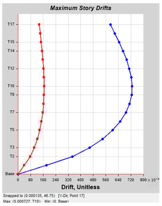 Figure 11 shows the displacement (m), which represents the maximum displacement in meters for each floor of the structure. The displacement values are small, lo., indicating a moderate structural behavior in terms of displacements. The red curve represents the drift of the upper floors under seismic action in the X direction (usually horizontal). This curve shows that the displacement in the upper floors increases as the intensity of the seismic load increases. The blue curve shows the displacement of the floors at the base of the structure, with an almost linear behavior relative to the base (greater displacement as floors increase).