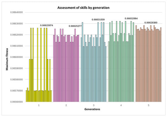 Finally, the performance of the genetic algorithm across generations, illustrated in Figure 7, shows a clear trend of progressive improvement followed by convergence. The value of R2 = 0.3613 suggests that only 36.13% of the variability in performance is explained by the number of generations, which indicates a moderate relationship. Even so, the GA exhibited significant improvement between Generation 1 and Generation 2. Subsequent generations improved more gradually, reaching convergence by Generation 5. The slight decline observed in the last generation suggests that the algorithm reached its maximum level of optimization under the established conditions.