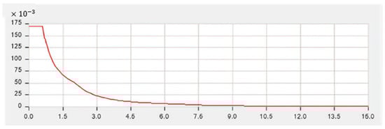 Table 4 shows the relationship between the period of vibration of the structure and its acceleration during a seismic analysis. The period of vibration refers to the time it takes for the structure to complete a cycle of vibration, which is related to the frequency of oscillation of the building. In this context, acceleration indicates how fast the structure moves due to seismic forces. As the period increases, indicating that the structure has a longer vibration cycle and therefore a lower oscillation frequency, the acceleration decreases. This is characteristic of structures that have greater flexibility, since the more rigid structures have a shorter period and respond with higher accelerations. In the table, it is observed that at 0 s (the shortest period), the acceleration is 0.1688, which represents the maximum acceleration observed for the shortest periods of vibration. Then, as the period increases (implying greater flexibility of the structure), the acceleration gradually decreases. For example, at 1 s, the acceleration is 0.1012, and at 5 s, the acceleration is 0.0081, much lower. This behavior is typical of structural systems, where structures with a longer period (more flexible) experience lower accelerations due to lower stiffness. At the end of the table, at 15 s, the acceleration is 0.0009, showing that for very long periods, the structure moves with a very small acceleration. This reflects how the dynamics of the structure change depending on its ability to vibrate, with more flexible structures responding with lower accelerations compared to more rigid ones. This can be demonstrated by the graph in Figure 8.