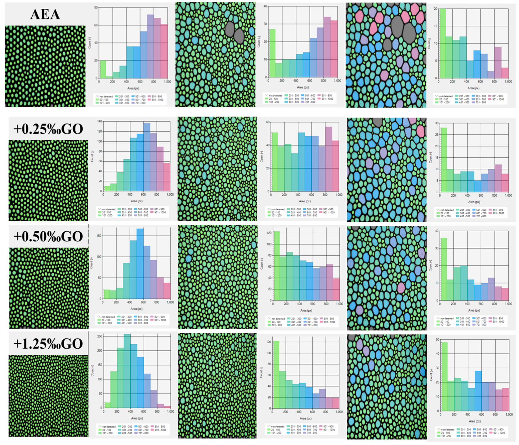 3.3. Effect of GO on Air Void of Hardened Mortar