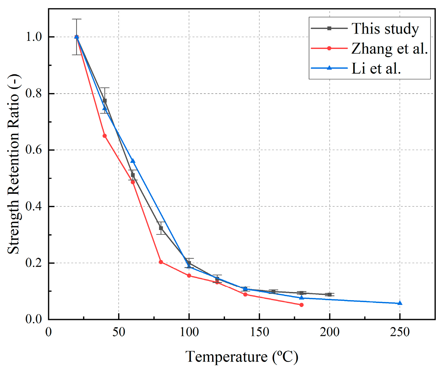 - When the temperature was elevated from room temperature to 100 °C and 200 °C, the load-bearing capacity declined by 38.26% and 54.05%, respectively. Upon cooling back to room temperature, the specimens recovered roughly 95% of their original strength, indicating that the observed losses were primarily thermo-elastic and that thermal decomposition had not yet been initiated.