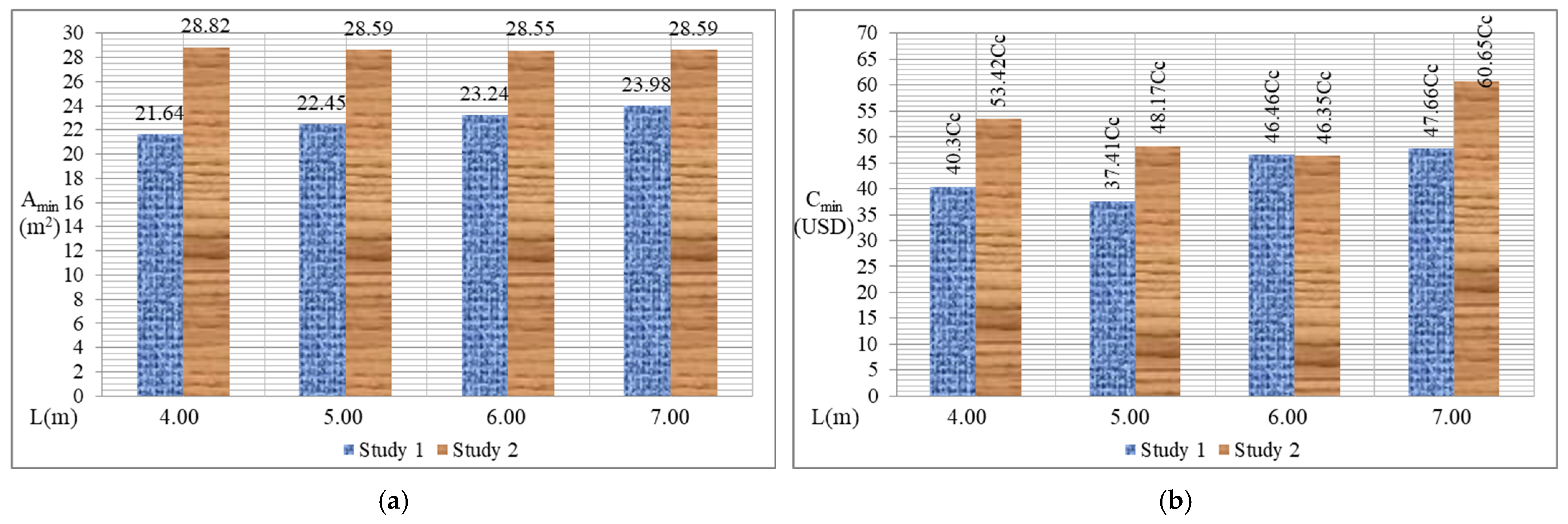 - When the spacing “L” between columns increases with free ends in the Y direction for these examples, the minimum cost “Cmin” tends to decrease to L = 5.00 m and then increases (see Table 2).