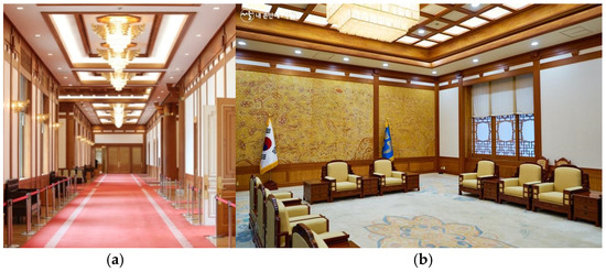 - Oh, I. A study on the expressiveness of interior designs shown in Korea’s Presidential residence and Office. Korean Inst. Inter. Des. J. 2006, 15, 3–13. [Google Scholar]