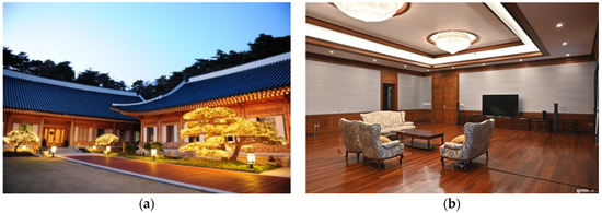 - Cheong Wa Dae. Press Release, Cheong Wa Dae Sarangchae, Newly Renovated to Align with Park Geun-hye Administrations’ Policy Direction; Record Number 1015025100000238; Cheong Wa Dae: Seoul, Republic of Korea, 2013; p. 1. [Google Scholar]