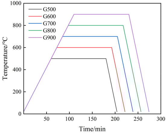 The coal gangue fractions (<4 mm) were prepared by using a PE125X1500 crusher. The calcination of coal gangue was achieved by using a rotary kiln (OTF-1200X-5D-R-III-G). The calcination process was set at a heating rate of 8 °C/min, a rotational speed of 2.5 r/min, and an aeration (air) volume of 5 L/min to the specified temperature, and then held for 2 h after natural cooling. Following a period of natural cooling, 300 g of calcined gangue samples was placed in an XY-4500 type powder mill. The samples were removed and sieved through a 120-mesh sieve after grinding for a period of 2 min. The same operational process was employed to prepare samples at temperatures of 500 °C, 600 °C, 700 °C, 800 °C, and 900 °C, respectively, for thermal activation of the coal gangue samples. These samples were coded as G26 (control), G500, G600, G700, G800, and G900. The calcination and cooling processes are illustrated in Figure 1.