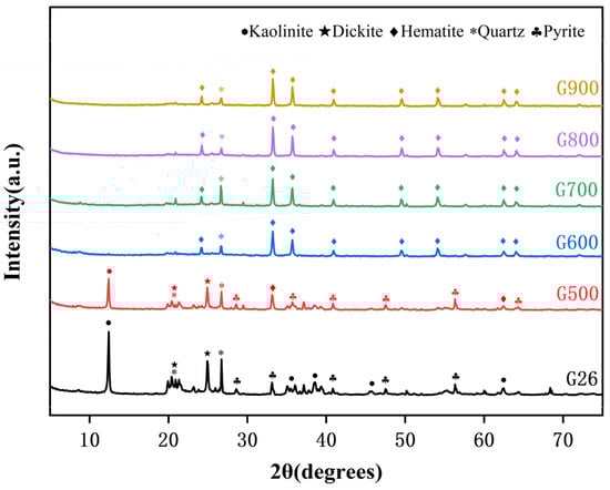 G500 shows that the intensity of the characteristic peak of kaolinite (d = 0.67424 nm) is weakened and the other diffraction peaks do not change much compared to G26, indicating that there is no significant change in mineral compositions. After the calcination temperature reached 600 °C, the peak of kaolinite (d = 0.67424 nm) that was invisible disappeared, which is due to the fact that kaolinite removes a large number of hydroxyl groups and its crystal structure is disrupted, changing from kaolinite to metakaolinite []. It can be seen that after 600 °C, a further increase in calcination temperature (900 °C) shows no significant influence on the mineral phase of the coal gangue. This is in agreement with the study of Wang et al. [].